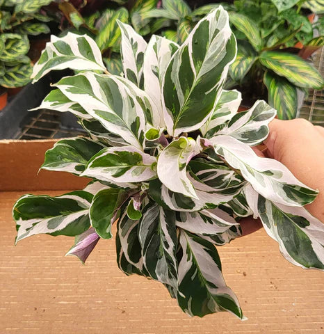 The Calathea White Fusion, scientifically known as Calathea 'White Fusion,' is a mesmerizing plant renowned for its striking variegated leaves. The foliage exhibits a combination of light green, white, and pink tones, creating an eye-catching mosaic-like pattern. The leaves offer a captivating contrast to the vibrant colors. The variegation patterns are often likened to brushstrokes on a canvas, making it an artistic masterpiece among indoor plants.