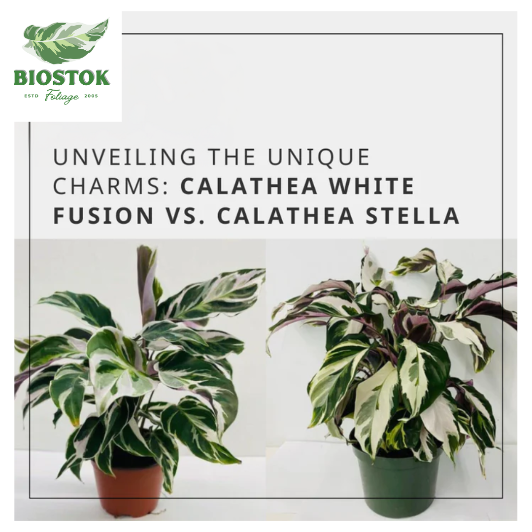 The Calathea White Fusion features variegated leaves with light green, white, and pink tones, while the Calathea Stella showcases elongated, lance-shaped leaves with deep green coloration and pale green stripes.