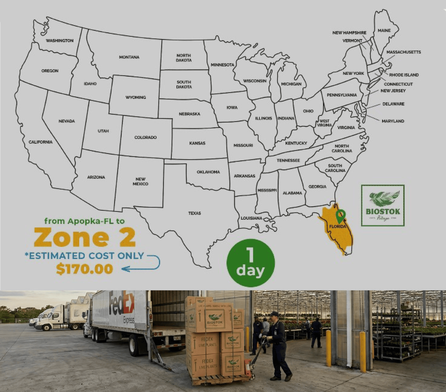 Discover the convenience of our ground delivery option in collaboration with Fedex. Refer to the map to identify your specific zone and view the estimated delivery time and cost for your selected box of plants.